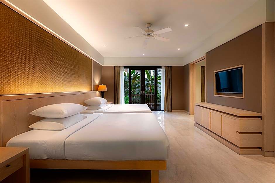 This twin bedroom features a balcony and electric kettle. This 45 sq. m. room features 2 twin beds and bathroom with separate shower and bathtub that artfully balances Balinese heritage with contemporary style.