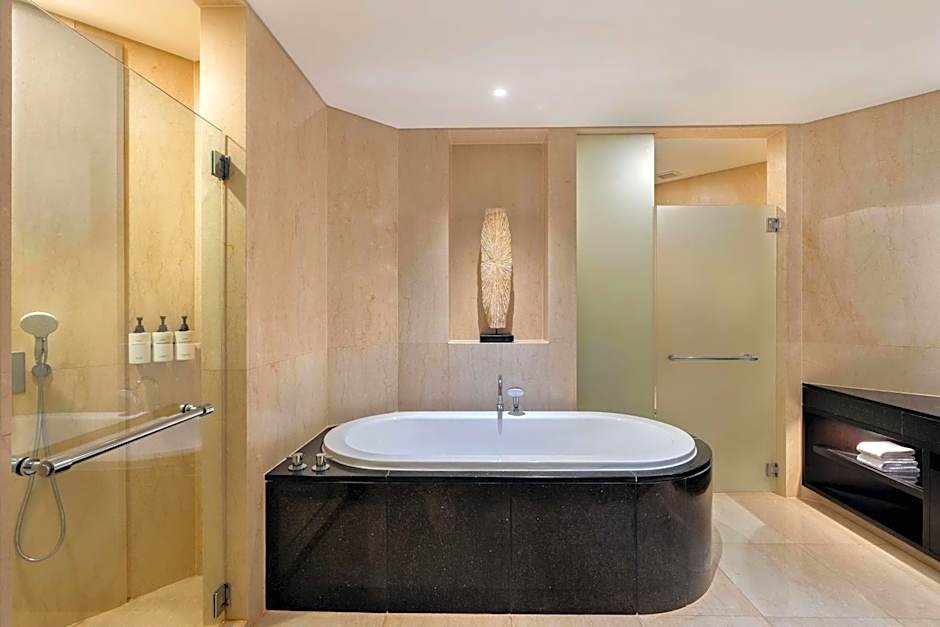 This twin bedroom features a balcony and electric kettle. This 45 sq. m. room features 2 twin beds and bathroom with separate shower and bathtub that artfully balances Balinese heritage with contemporary style.
